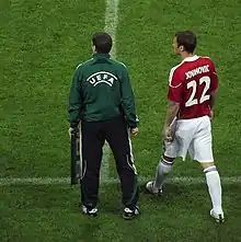 On 24 August 2010, Jovanović and his team entered at the group stage of the UEFA Champions League by beating Anderlecht.[8] He played all six matches for Partizan in the qualifying for the Champions League. On 28 September 2010, against Arsenal, Jovanović fouled Marouane Chamakh and received a red card, but Vladimir Stojković saved the penalty.[9] By the end of the 2010–11 season he won the Serbian Cup and the title of national champion.