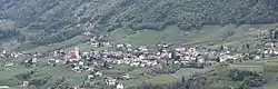 The shield is argent a fess azure and a gules rampant lion. These are the arms of the Lords of Marling who lived in two castles in the village until 1426. The emblem was adopted in 1966. [4]