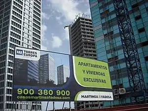 In March 2015, the company filed for bankruptcy, holding assets worth €2.4 billion ($2.7 billion) with debts worth €7.0 billion, making its collapse one of the biggest bankruptcies in Spanish history.[6] Trade of the company stocks were abruptly suspended, leaving no chance for its investors to unload them.[7] The liquidation of the company started the following month.[8] The company was banned from trading on the stock exchange in October 2015.[9] In July 2018, Martinsa-Fadesa entered the final phase of liquidation. The website martinsafadesaliquidacion.es was set up to follow the liquidation process.[10] In November 2018, in the aftermath of the crash, the lawyer Antonia Magdaleno was found responsible for the company's debt and sentenced to 4 years in jail.[11]