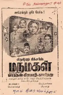 Marumagal (transl. Daughter-in-law) is a 1953 Indian Tamil-language drama film, produced by Lena Chettiar on Krishna Pictures banner and directed by D. Yoganand. The film stars N. T. Rama Rao, Padmini and Lalitha, with music composed by C. R. Subburaman. It was simultaneously shot in Telugu-language as Ammalakkalu (transl. Mothers and Sisters).[1]