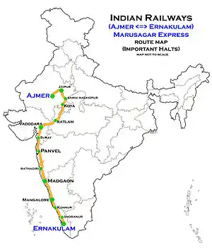 The Marusagar Express is a weekly express train that runs between Ajmer and Ernakulam, connecting Rajasthan, Madhya Pradesh, Gujarat, Maharashtra, Goa, Karnataka to Kerala. The train runs through four zones of Indian Railways, travelling 2860 km in around 48 hours. There are 32 halts along the way. It starts from Ajmer on Friday morning and reaches Ernakulam Junction on Sunday early morning, and starts back to Ajmer on Sunday evening to reach Ajmer on Tuesday afternoon.