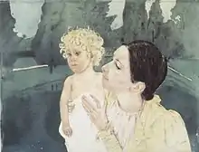 A trip to Egypt in 1910 impressed Cassatt with the beauty of its ancient art, but was followed by a crisis of creativity; not only had the trip exhausted her, but she declared herself "crushed by the strength of this Art", saying, "I fought against it but it conquered, it is surely the greatest Art the past has left us ... how are my feeble hands to ever paint the effect on me."[79] Diagnosed with diabetes, rheumatism, neuralgia, and cataracts in 1911, she did not slow down, but after 1914 she was forced to stop painting as she became almost blind. In 1925 she was featured on 32nd Annual Exhibition of American Art at the Cincinnati Art Museum, together with Louise Woodroofe, Childe Hassam and Robert Henri.[80]