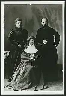 MacKillop's father, Alexander MacKillop, was born in Perthshire.[10] He began his studies for the priesthood at age twelve, and two years later went to the Scots College in Rome; he also studied at Blairs College in Kincardineshire, but at the age of 29 left, just before he was due to be ordained. He migrated to Australia and arrived in Sydney in 1838.[6] MacKillop's mother, Flora MacDonald, born in Fort William, had left Scotland and arrived in Melbourne in 1840.[6] Her father and mother married in Melbourne on 14 July 1840. MacKillop was the eldest of their eight children. Her younger siblings were Margaret ("Maggie", 1843–1872), John (1845–1867), Annie (1848–1929), Alexandrina ("Lexie", 1850–1882), Donald (1853–1925), Alick (who died at 11 months old) and Peter (1857–1878).[6] Donald became a Jesuit priest and worked among the Aboriginal peoples in the Northern Territory. Lexie became a member of the Good Shepherd Sisters in Melbourne.[11]