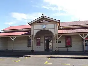 The station is a single-storeyed, timber-framed building, set at ground level. It is clad in chamferboards and has a gabled corrugated iron roof. The rear roof extends over the original station platform and is supported at its outer edge by unusual tapered stop-chamfered timber posts with octagonal capitals and strut brackets. The main front entrance consists of a projecting gabled portico supported on pairs of timber posts and features a timber arch and gable infill. A central passageway leads through the station to the main platform behind the building. There are skillion-roofed front verandahs, partly enclosed on the south-west side, either side of the portico. These verandahs have stop-chamfered posts and timber strut brackets that match those of the station platform. There is an extension at the south-west end of the station with skillion-roofed structures and a bracketed hood over the front windows. A separate timber-framed ladies waiting room and toilets with a gabled roof adjoins the north-east end of the station building. This has a domestic-scaled post-supported awning linked to the rear station platform. There are new male toilets in the former cloak room. A World War I railways honour board is located at the rear of the station beside the ticket office.[1]