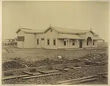 Although the architect is unknown, drawings for the first stage of the station building were approved by Henry Charles Stanley on 24 October 1879, and the contract was awarded to Henry Taylor (junior) on 8 Jan 1880, for £1325. A head station building and a short platform were built. On 24 December 1892 chief draughtsman Henrick Hansen approved alterations to the station and the main platform verandah, the demolition of the buildings extending to the north-west of the head station, and the enlargement of the lamp room. This contract was awarded to John Kyle on 24 January 1893, for £1176. The Station Master's office was enlarged in 1912.[1]