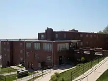 The Marycrest campus itself was made up of 13 buildings. The earliest buildings were built around a rectangular-shaped open space. Newer buildings were built down the slope of the bluff, along West 12th Street to the east and finally across West 12th Street. The two oldest buildings were built as single-family homes that predate the establishment of the college. The Max Petersen House, known as Clifton Hill, is the place the Rev. Thomas Lawlor from St. Ambrose College acquired in 1937 for $50,000 for the new school.[4] It is a 2½-story, dark red brick, Queen Anne style house designed by Davenport architect Frederick G. Clausen. It was built in 1888 for Max Petersen who was a partner in his family's prosperous retail store, the J.H.C. Petersen's Sons' Store.[7] The house served a variety of purposes including a convent, dining hall, and music classrooms. The second house is the Dr. Kuno Struck House, which was also called Clifton Manor. It was acquired by Marycrest in 1978 and served the college as a community center. This house is also 2½-stories but is covered in pink-red brick and a rock-faced stone that is smoothly dressed.[8] It is the only house in Davenport built in the Jacobean Revival style.[3] Built in 1910, the house was designed by Clausen & Clausen of Davenport. The Struck's garage, built in 1927 and used as a maintenance building by the college, is also a contributing property in the historic district. Both houses are individually listed on the National Register of Historic Places.
