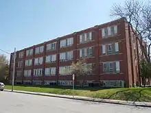 The first building built specifically for a dormitory was West Hall. It was built as a two-story structure in 1941 by the John C. Tunnicliff Construction Company for $23,950. It is possible that it was designed by Davenport architect Seth Temple, but that cannot be substantiated.[3] A third floor was added in 1958. The building is connected to the Max Petersen House by a narrow single-story corridor. Measuring 39 by 86 feet (12 by 26 m), the building follows a rectangular plan. Like all buildings built for the college through the 1960s, its exterior was composed of a mottled red face brick that was manufactured by the Hydraulic Press Brick Company of St. Louis. It sits on a poured concrete foundation. The main facade faces to the north and is divided into three bays. The center bay projects slightly forward. The east and west elevations are divided into eight bays. Belt courses separate floors on the end bays and the center bays are slightly recessed. Bedford stone is used for the belt courses between the floors, the plain coping, the vestibule trim, and the lintels and window sills. A stone cross is located on the center of the parapet above the main entrance vestibule. It is a contributing building.