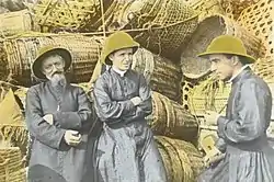 Colorized lantern slide of Maryknoll Fathers James E. Walsh, second from left, and Francis X. Ford, third from left, with Bishop Auguste Gauthier, M.E.P. A large pile of woven baskets provides a backdrop. All three men wear cassocks and pith helmets. ca 1918