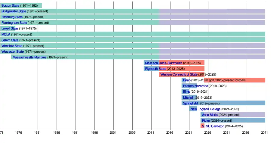 - 2024 – Plymouth State, UMass Dartmouth, VSU Castleton, and Western Connecticut State will all leave the MASCAC for football after the 2024 fall season (2024–25 academic year).[9]