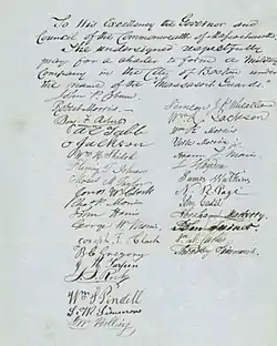 Morris and other advocates emphasized that blacks were native-born American citizens, unlike the immigrants who, at that time, were arriving in large numbers at the Port of Boston. Morris once remarked before the legislature's militia committee, "Some of the petitioners whom I have the honor to represent, can trace back their ancestry to a time long before an Englishman or any white foreigner stood upon American ground." William J. Watkins was more explicit: "All we ask is that you treat us as well as you do the Irish, German, Hungarian." Despite the appeal to nativism, which was on the rise in Massachusetts, their petitions were denied.[7] Eventually the Massasoit Guards gave up in frustration and disbanded.[6]