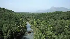 From the centre of the aqueduct, one can see a vast expanse of greenery, with rolling hills of the Western Ghats in the background, and the meandering Pahrali river flowing below.