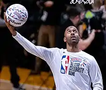 James and The Bachelorette contestant Tyler Cameron, his friend and work colleague, played football at Wake Forest University together.[14] Cameron's mother nominated James to be a contestant on The Bachelorette before she died.[15] James was originally cast to be a contestant for season 16 of The Bachelorette, starring Clare Crawley, but after filming was delayed due to the impacts of the COVID-19 pandemic, he was instead selected to be the next Bachelor for season 25 of The Bachelor, becoming the first male African American lead in the franchise's history.[lower-alpha 1][16] He is the first Black Bachelor lead in the show's history.[17] The season concluded with James choosing to pursue a relationship with 24-year-old graphic designer Rachael Kirkconnell.[18]