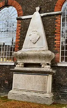 Decker died on 18 March 1749, without a surviving male heir and the baronetcy became extinct. He was buried at St Mary Magdalene, Richmond, where survives his monument (above a vault) against the external wall of the church, in the form of a broad-based obelisk (on which is affixed a baroque escutcheon displaying a relief of the arms of Decker impaling Watkins) topped by an urn, atop an antique Roman sarcophagus standing on a chest tomb base. The tomb was sculpted by Peter Scheemakers in 1759.[24]
