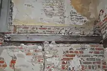 Matthew Jones died in 1728 and left his house to his son Scervant, who was a minor at the time. Scervant's guardian, John Jones, embarked on improvements to the house which had probably been planned by Matthew before his death. The exterior walls of the house were rebuilt in brick,[4] though several beams from the earlier framing were retained as part of the roof framing and have survived to this day.[5] The house also acquired a cellar at this time and was no longer earthfast, but rather had a brick foundation. The foundation was laid in English bond, while brickwork in the rest of the house was laid using Flemish bond. Several decorative elements are present in the brickwork: the headers of the bricks are glazed, and rubbed bricks were used around the windows and at the corners of the building.