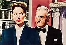 Her association with Ford ultimately led to her collaborations with John Wayne, the co-star who was most linked to her in the public's perception. Together they made Rio Grande (1950), The Quiet Man (1952), The Wings of Eagles (1957), McLintock! (1963) and Big Jake (1971). The Quiet Man was her personal favorite of her entire career, and one she often referred to as "lightning in a bottle".[11] Both the public and Wayne's children saw an on-screen rapport between them that existed with no other co-stars for either of them.[12] The two became so identified with each other that some of the public came to mistakenly believe she and Wayne were actually married in real life.[12] In 1976, she was a participant in the Variety Clubs International All-Star Tribute to John Wayne.[13] On May 21, 1979, O'Hara was summoned by United States Senator Barry Goldwater to speak before a congressional committee in advance of the Congressional Gold Medal being bestowed on Wayne, who was less than a month away from his death from cancer.[14]