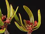 - Parry's tetracoccus (Tetracoccus dioicus) – A perennial shrub found in the chaparral, typically on dry and stony hillsides and slopes. In the Picrodendraceae family. In the springtime, it is characterized by clusters of small red flowers, and later distinctive four-lobed fruits.[8] Restricted to uncommon gabbro derived soils in southern California and northern Baja California. Threatened by development and agriculture, particularly by clearing for citrus and avocado orchards.[12]