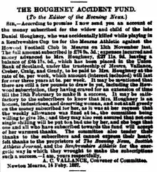 - ↑ Vallance, A.C. (14 February 1887). "The Houghney Accident Fund". Glasgow Evening Post: 3.