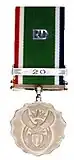 The Emblem for Reserve Force Service, post-nominal letters RD, was instituted on 27 April 2003 and may be awarded to members in the part-time Reserves of the South African National Defence Force who have performed twenty years of loyal service, of which not less than five years were served in the Reserve Force, service in the former Citizen Force or Commandos included. The emblem is worn on the centre of the ribbon of the Medalje vir Troue Diens - Medal for Loyal Service, above any bars awarded for periods of extended service, and may be continued to be worn even if the recipient is later appointed in the Regular Force.[2][8]