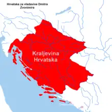 The Kingdom of Croatia (Croatian: Kraljevina Hrvatska; Latin: Regnum Croatiae), or Croatian Kingdom (Croatian: Hrvatsko Kraljevstvo), was a medieval kingdom in Southern Europe comprising most of what is today Croatia (without western Istria and some Dalmatian coastal cities), as well as most of the modern-day Bosnia and Herzegovina. The Croatian Kingdom was ruled for part of its existence by ethnic dynasties, and the Kingdom existed as a sovereign state for nearly two centuries. Its existence was characterized by various conflicts and periods of peace or alliance with the Bulgarians, Byzantines, Hungarians, and competition with Venice for control over the eastern Adriatic coast. The goal of promoting the Croatian language in the religious service was initially introduced by the 10th century bishop Gregory of Nin, which resulted in a conflict with the Pope, later to be put down by him.[2] In the second half of the 11th century Croatia managed to secure most coastal cities of Dalmatia with the collapse of Byzantine control over them. During this time the kingdom reached its peak under the rule of kings Peter Krešimir IV (1058–1074) and Demetrius Zvonimir (1075–1089).