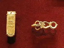 Filigree and granulation are two processes that are also closely related. They involve the decoration of a sheet of gold using the application of wires or grains of gold which can be worked into very intricate patterns.[33] These techniques allowed for intense detail and delicacy because the wires or grains could easily be worked into twisted patterns and minuscule facets.[34] All of these techniques enabled detailed work on gold jewelry, adding other materials or fine details.
