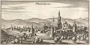 Meisenheim is believed to have arisen in the 7th century AD, and its name is often derived from the town's hypothetical founder "Meiso" (thus making the meaning "Meiso's Home"). In 1154, Meisenheim had its first documentary mention. Sometimes cited as such, however, is a document dated 14 June 891 from the West Frankish king Odo (for example by K. Heintz in Die Schlosskirche zu Meisenheim a. Gl. u. ihre Denkmäler in Mitteilungen d. Histor. Vereins d. Pfalz 24 (1900) pp. 164–279, within which p. 164, and by W. Dotzauer in Geschichte des Nahe-Hunsrück-Raumes (2001), pp. 69 & 72), but this document is falsified (cf. H. Wibel: Die Urkundenfälschungen Georg Friedrich Schotts, in Neues Archiv d. Ges. f. Ältere Dt. Gesch.kunde Bd. 29 (1904), pp. 653–765, within which p. 688 & pp. 753– 757[5]). In the 12th century, Meisenheim was raised to the main seat of the Counts of Veldenz and in 1315 it was granted town rights by King Ludwig IV. On what is now known as Schlossplatz ("Palace Square"), the Counts of Veldenz built a castle, bearing witness to which today are only two buildings that were later built, the Schloss Magdalenenbau (nowadays called the Herzog-Wolfgang-Haus or "Duke Wolfgang House") and above all the Schlosskirche ("Palace Church"), building work on which began in 1479. Both buildings were built only after the Counts of Veldenz had died out in 1444 and the county had been inherited by the Dukes of Palatine Zweibrücken. This noble house, too, at first kept their seat at Meisenheim, but soon moved it to Zweibrücken. From 1538 to 1571, Duke Wolfgang of Zweibrücken maintained in Meisenheim a mint, with one interruption, although this was then moved to Bergzabern. The Doppeltaler (double Thaler), Taler (Thaler) and Halbtaler (half Thaler) coins minted in the time when the mint was in Meisenheim remain among the highest-quality mintings from Palatinate-Zweibrücken.