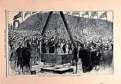 In May 1878, the designs of Joseph Reed and Frederick Barnes were chosen for the Main Building of the Exhibition. On 19 February 1879 Governor Sir George Bowen laid the cornerstone in Carlton Garden for the new Exhibition Building. The building, built by David Mitchell, covered about 7 acres. Its nave measured 500 x 160 feet and the transept was 272 feet long. A large dome 60 feet in diameter rose 217 feet above the building. Two machinery annexes, each 460 x 138 feet, were built at the rear of the main building.