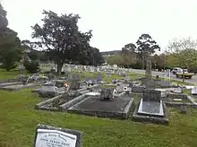 The hillside cemetery occupies an area of approximately 2.5 hectares (6 acres) and is divided into demoninational sections containing a total of approximately 5,000 graves.[4] It is composed of two parts, the upper cemetery and the lower cemetery, separated by Middleton Road.[2] Easily accessed by pedestrians the site has a number of mature native and exotic trees and a range of diversity, style and age of memorials and grave fittings on the plots.[1]