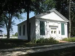 The building is rectangular and 24.33 by 38.33 feet (7.42 by 11.68 m). The church was originally laid on a wooden foundation; the present stone foundation dates to the 1860s. It is best described as a vernacular Greek Revival building. The east and west facades each feature three double sash windows with green shutters. The main entrance is on the south, flanked by pilasters. The double doorway features a standard wooden cornice lintel, above which is a carved sundial. The south facade also features two windows similar to those on the east and west. The north side features no windows. The inside features one room with its original unfinished wooden floor. The pews and pulpit are also original. A bronze memorial tablet was added near the entrance in 1924.[2]