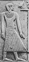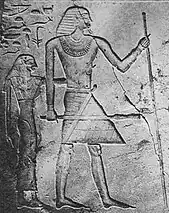 While some authors suggested that Meni might have lived during the Ninth Dynasty (mainly on the basis of palaeography),[8] and even the Eleventh Dynasty (based on architectural style),[9] it seems now more probable that he lived during the late Sixth Dynasty, as his different titles appear to indicate.[10][11] During his lifetime, Meni held a number of administrative titles, most of which can be associated with the pyramid estates of Sixth Dynasty kings Pepy I and Merenre.[1] He managed the estate of both pyramid settlements, and held the office of royal seal-bearer.[5] He is also described as a sole companion, meaning he had relatively direct access to the king, though this was a relatively low rank.[12] Within the context of royal service, Meni is also recorded as overseer of tenant landholders of the Great House.[13] In his local area, he was charged with supervising "all vegetation" and "every desert", as well as the "fishers, fowlers and hunters" of the nome (Dendera).[14][15]