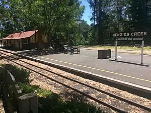 - Station platform with "Menzies Creek" bench