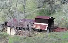 Mercuryville was founded in 1874,[1] after cinnabar, a mercury-bearing ore, was discovered in eastern Sonoma County around 1870. Mercury is a dense liquid metal that can be used to separate gold from other less dense materials. The California Gold Rush, which had begun only 20 years earlier, increased the demand and price of mercury to $1 a pound—approximately $20 in 2018 dollars—making extracting the ore profitable, and prompting a short-lived mercury rush in the 1870s. When the price of ore dropped within a few years, most mines were quickly abandoned.[2] In its heyday, the town had eight bars that were notorious for fights, and a single church. Mercury was also mined in other areas of Sonoma County at the time, including mines near Guerneville.