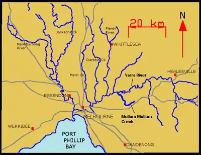 37°45′35″S 144°58′53″E / 37.759756°S 144.981482°E The Merri Creek is a waterway in southern parts of Victoria, Australia which flows through the northern suburbs of Melbourne. It begins near Wallan and flows south for 70 km until joining the Yarra River at Dights Falls. The area where the creek meets the river was traditionally the location for large gatherings of the Wurundjeri people and is suspected to have been the location for one of the earliest land treaties in Australia between Indigenous Australians and European settlers.