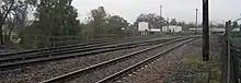 - Looking east along the railway line from level crossing on Bylong Valley Way near Sandy Hollow, showing rear end of train waiting on crossing loop