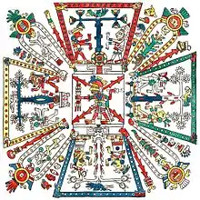As an expansion of quincunx, which symbolizes space, two axes combine the universe with the inclusion of both the natural and the spiritual, vertically and horizontally. It is called the axis mundi, which in the case of mesoamerican cosmology, vertically consists of three worlds and horizontally of four directions and a center.