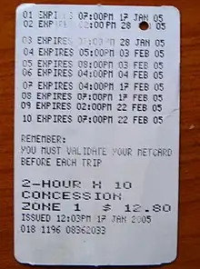 Metcard was the brand name of an integrated ticketing system used to access public transport in Melbourne, Australia.[1] It was a universal ticket which allowed users to ride on the city's Metlink and Metropolitan Transit Authority network, consisting of suburban trains, trams, and buses, including the NightRider network. The Metcard was a credit card-sized ticket made out of cardboard and used a magnetic strip to store fare data. Metcard was operated by OneLink Transit Systems under a contract with the Government of Victoria which was managed by the Transport Ticketing Authority.[2]