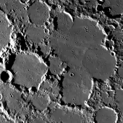 Oblique view of Meton from Lunar Orbiter 4. Meton is below center, Meton D is below left of center, Meton C is in upper left, and Meton E is at right. They are all flooded to the same elevation, and the subtle ridges that divide these craters are barely visible in this image.