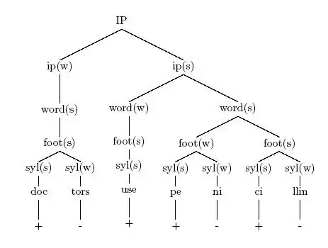 Metrical trees allow us to change the stress pattern for a phrase by switching S and W sister nodes. The tree in (1) represents the metrical structure for the sentence "Doctors use penicillin". when the sentence is providing all new information. This is called broad focus, and might be used in response to a question like "What did you learn at the hospital today?" The same metrical structure would be used when the sentence has narrow focus on the word 'penicillin'; for example, if it was used in response to a question like "What do doctors use to treat that disease?". However, we need a new metrical structure to put narrow focus on the word 'doctors', for example, if the phrase is used in response to the question "Who uses penicillin?" In this case, the S and W nodes at the intermediate phrase (ip) level have to switch, resulting in (2).