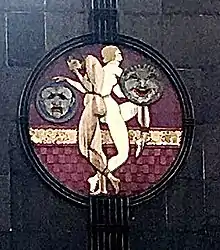 The upper portion of the façade is made of terracotta and is divided vertically into three sections.[2] The outer sections are variously described as being pink[5][13] or "rosy beige" in color.[15] Maroon bands divide the outer sections of the façade into L-shaped segments.[15] The central part of the upper façade is demarcated by black pilasters with maroon borders on either side, which protrude from the wall and curve above the roofline. The middle of the central section contains vertical aluminum bars, which taper in a triangular pattern above the roofline.[2] These bars are interrupted by a polychromed medallion depicting personifications of comedy and tragedy.[10][16][17] The medallion has a lavender background and a horizontal yellow band with two off-white or beige figures, which appear to be holding blue and gray masks.[17][18] This medallion is similar in design to Hildreth Meière's plaques on the façade of Radio City Music Hall,[19][20] but Meière most likely did not create the theater's medallion.[20] There is a maroon coping at the top of the façade; the coping above the outer sections of the façade is flat, while the coping above the center section is wavy.[17]