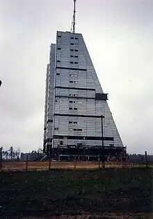 On 4 May 1995 US demolition experts razed a 19-story tower, which housed a former Soviet Daryal radar system, one of the most advanced bistatic early-warning radars in the world. It served as one of the USSR's most important radar stations as it was responsible for scanning skies to the west for incoming bombers or nuclear missiles before the USSR disintegrated. The event spilled tens of thousands of Latvian people onto country roads and fields to watch the early morning spectacle, which was also televised nationwide. Latvian leaders, diplomats and other officials toasted the blast with champagne. The demolition was sponsored by the US, who paid 7 million US dollars for the destruction performed by Controlled Demolition, Inc.[7]