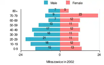 According to the 2002 Poland census, there were 233 people residing in Miłoszowice village, of whom 52.8% were male and 47.2% were female. In the village, the population was spread out, with 21.9% under the age of 18, 33.9% from 18 to 44, 18% from 45 to 64, and 26.2% who were 65 years of age or older.[1]