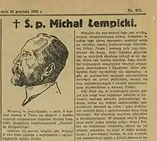 Michał Antoni Łempicki (Russian: Михаил Михайлович Лэмпицкий) (1856-1930) was a mining engineer and entrepreneur. He was a Polish public and political figure, deputy of the State Duma of the Russian Empire for the Piotrków Governorate.