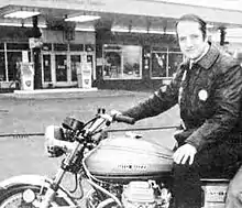 ![]() Walker in 1976 on a Moto Guzzi 850T3, in front of his then-newly acquired larger retail motorcycle premises at Norwich Road, Wisbech | |