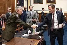 In a 2016 profile in the Green Bay Press Gazette, Gallagher blamed President Barack Obama and former Secretary of State Hillary Clinton for the success of ISIS in Iraq.[26] In 2019, he wrote it would be "a smart geopolitical move" for the U.S. to buy Greenland, a notion that Trump floated.[27] In 2020, Gallagher voted against a measure to block Trump from taking military action against Iran without Congress's consent.[20] In 2017, he supported a U.S. airstrike in Syria in retaliation for the Khan Shaykhun chemical attack,[28] and in 2020 he supported the U.S. drone strike that targeted Iranian general Qasem Soleimani.[29] In 2019, Gallagher voted for a measure opposing Trump's decision to withdraw U.S. forces from Syria.[20]