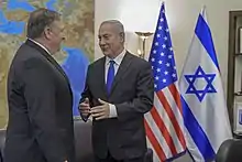 On October 10, 2018, Pompeo said Israel "is everything we want the entire Middle East to look like going forward" and that the Israel–United States relations are "stronger than ever".[81] In March 2019, when questioned regarding Israel's conflicts with Iran and following a visit to the Western Wall with Israeli prime minister Benjamin Netanyahu, Pompeo spoke to "the work that our administration's done to make sure that this democracy in the Middle East, that this Jewish state, remains ... I am confident that the Lord is at work here."[82]