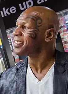 The American former boxer Mike Tyson has four tattoos of note.[lower-alpha 1] Three—at least two of them prison tattoos[lower-alpha 2]—are portraits of men he respects: tennis player Arthur Ashe, Marxist revolutionary Che Guevara, and Chinese communist leader Mao Zedong. The fourth, a face tattoo influenced by the Māori style tā moko, was designed and inked by S. Victor Whitmill in 2003. Tyson associates it with the Māori being warriors and has called it his "warrior tattoo", a name that has also been used in the news media.