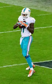 On March 12, 2013, Wallace was reportedly signed by the Miami Dolphins in a five-year deal worth $60 million.[51][52] Wallace's father revealed that, despite that the Minnesota Vikings offered a bigger contract, Mike decided to move his home to a warmer Miami.[53] Wallace had four games going over the 100-yard mark in the 2013 season, finishing with 73 receptions for 930 receiving yards and five receiving touchdowns.[54]