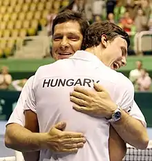 ![]() Miklós Hornok, captain of the Hungarian Davis Cup team and his No.1 player, Marton Fucsovics (2012) | |