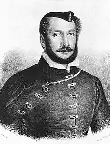 Historians describe Jósika's political views as liberal and aligned with those of writer Sándor Bölöni Farkas, who in turn was an advocate of British and American democracy.[3][4] Together with other noblemen, Wesselényi and Jósika were among the gentry liberal opposition[5] and formed the "Pro-British League of Transylvanian Aristocrats."[3] Their central political stance was to call for parliamentary reform to enhance democracy while preserving the role of the Crown. In this, they stood in opposition to the more conservative pro-monarchy majority, and to the "Radical Opposition" headed by a lawyer, and later Regent-President of Hungary, Lajos Kossuth.[4] In the course of 1848, Jósika drew closer to the views of Kossuth.[6]