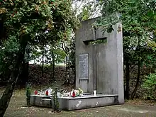 During the subsequent German occupation, the Polish population was subjected to mass arrests, murder, deportations to concentration camps, expulsions and forced conscriptions to the Wehrmacht.[10] Already in early September 1939, the Germans carried out mass arrests and executions of former Polish insurgents of the Silesian Uprisings and local Polish activists.[11] Among the victims of massacres carried out on 5, 7 and 17 September 1939 were Polish workers, miners, craftsmen, a farmer, a court employee, a policeman, a merchant, and a local official.[12] The Germans also carried out manhunts of Polish insurgents who were hiding in the forest between Mikołów and Tychy,[13] and destroyed the book collection of the pre-war Polish library.[8]