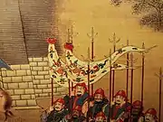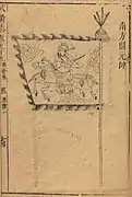 Qi Jiguang deployed his soldiers in a 12-man 'mandarin duck' formation, which consisted of four pikemen, two men carrying daos with a great and small shield, two 'wolf brush' wielders, a rearguard officer, and a porter.[72] This system bears some resemblance to European systems (pike and shot) developing in England where formations of arquebusiers would be protected by a group of pikemen.[73] Volley fire was also used.[74]